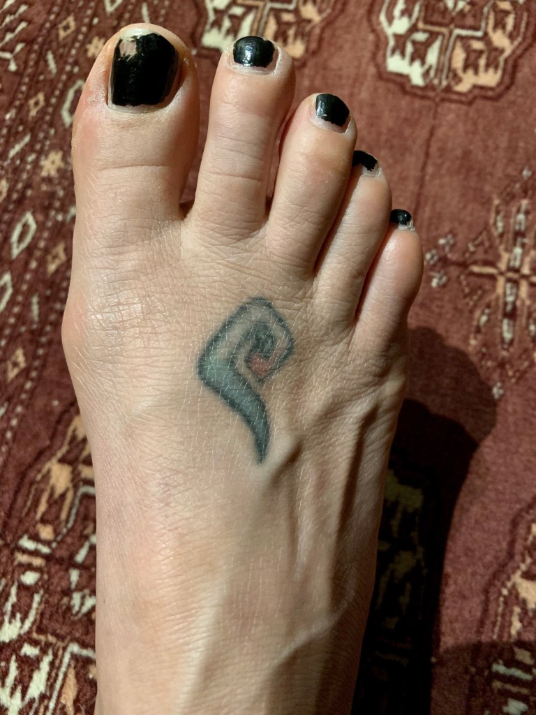 I had a vision or daydream about the foot image; went by myself into the scary tattoo shop in broad daylight, and bravely asked the huge bearded guy behind the counter if he would ink me.
