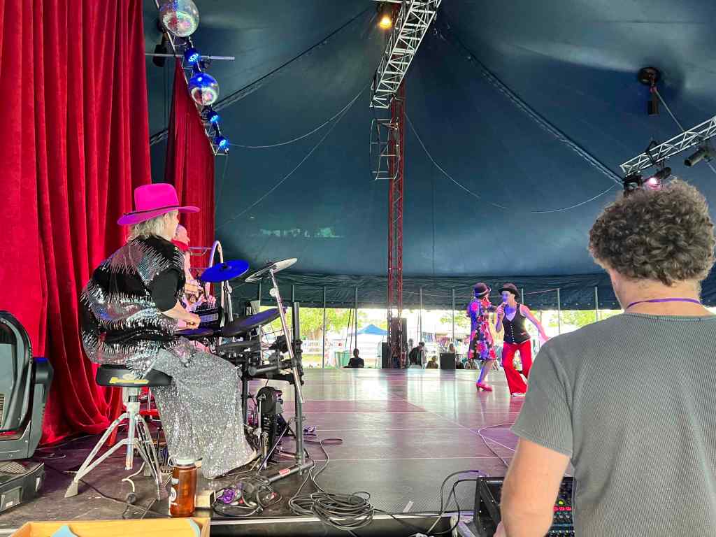 She was one of the performers for the Over 50s Cabaret as part of the Mullumbimby Circus Festival, and that’s how I found myself lugging my new old kit and heavy amp down to a circus marquee for ‘sound check’.