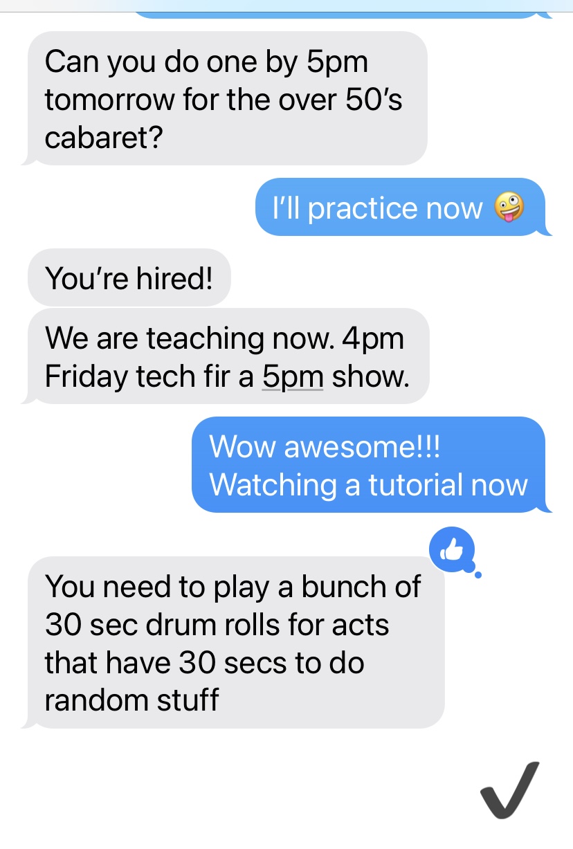I brought to the stage my naive confidence, my enthusiasm, my natural sense of timing, and my utter humility in the presence of REAL musicians (who have actually toured the world with companies like Circus Oz and Circus Monoxide), plus my sequinned pants.